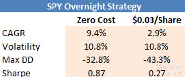 To implement such a strategy, the costs can be immense. Let’s take the case of SPY with about 252 trading days. That means 252-round trades. Even if each round trade were to cost you only a few basis points, it can still pack a pretty strong punch.