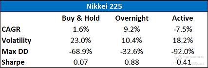 Nikkei 225 Buy & Hold, Overnight and Active Strategy Performance