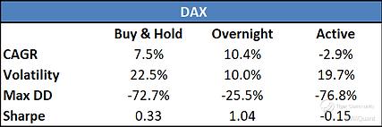 DAX Buy & Hold, Overnight and Active Strategy Performance