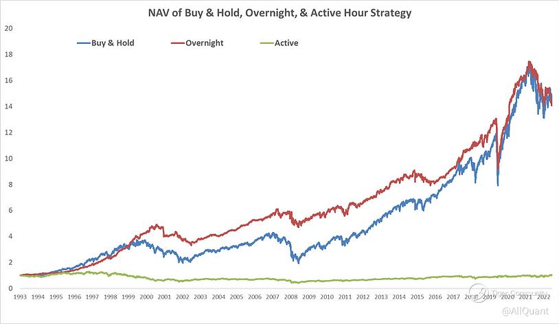 For a start, let’s track the overnight and active hour returns of SPY (S&P 500 ETF) since its inception in 1993. Let’s also assume there are no transaction costs. In order to capture the overnight returns, we invest at the market close each day and then close out the position when the market next opens. Similarly, to get the active hour returns, we invest at the opening of each day and liquidate the position when the market closes on the same day. With these returns, we can build a Net Asset Value (NAV) series that shows how each performed over time and we also compare them against a simple Buy and Hold strategy on SPY.