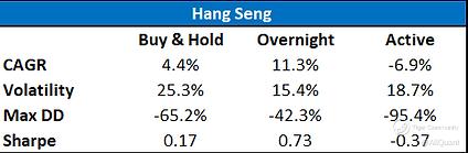 Hang Seng Buy & Hold, Overnight and Active Strategy Performance