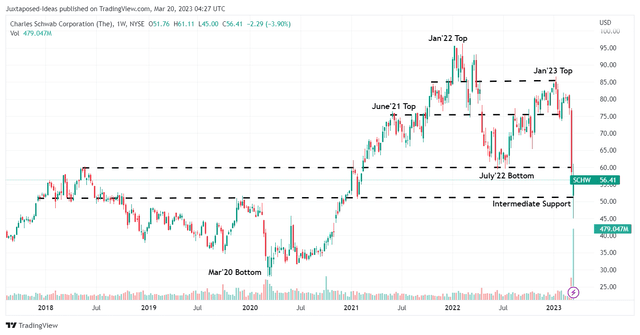 We believe The Charles Schwab Corporation (NYSE:SCHW$Charles Schwab(SCHW)$ ) has been overly sold at these levels, negatively impacted by the banking crisis over the past two weeks. Particularly, we think the pessimism is unwarranted since SCHW is primarily a brokerage company, with a value-added banking service to support its clients' asset management.