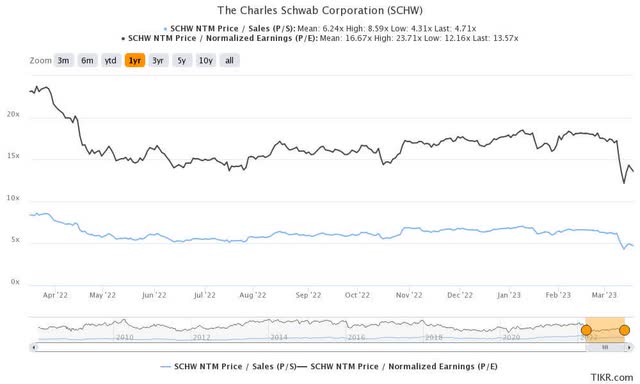 SCHW is currently trading at a Price/Sales of 4.71x and NTM P/E of 13.57x, lower than its 3Y pre-pandemic mean of 5.94x and 19.31x, respectively. Otherwise, it is still moderately lower than its 1Y mean of 6.24x and 16.67x, respectively.