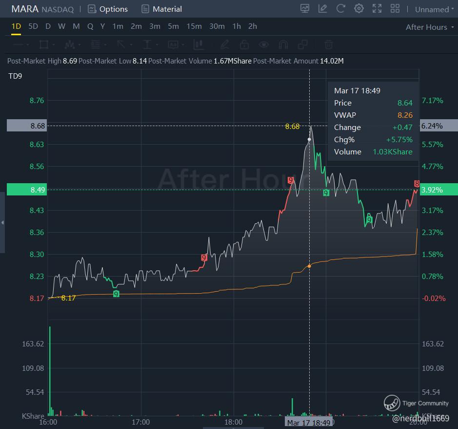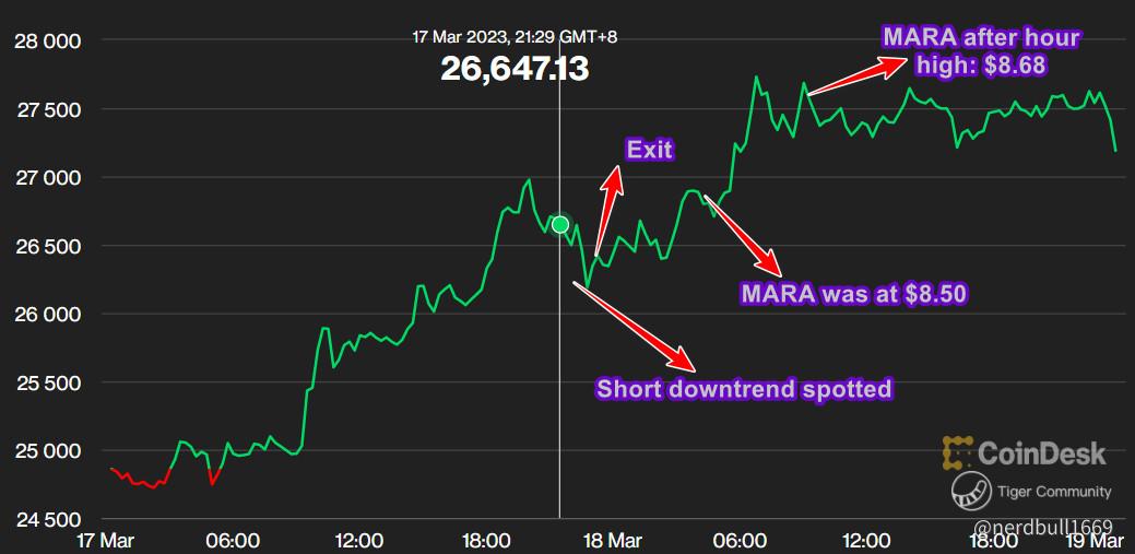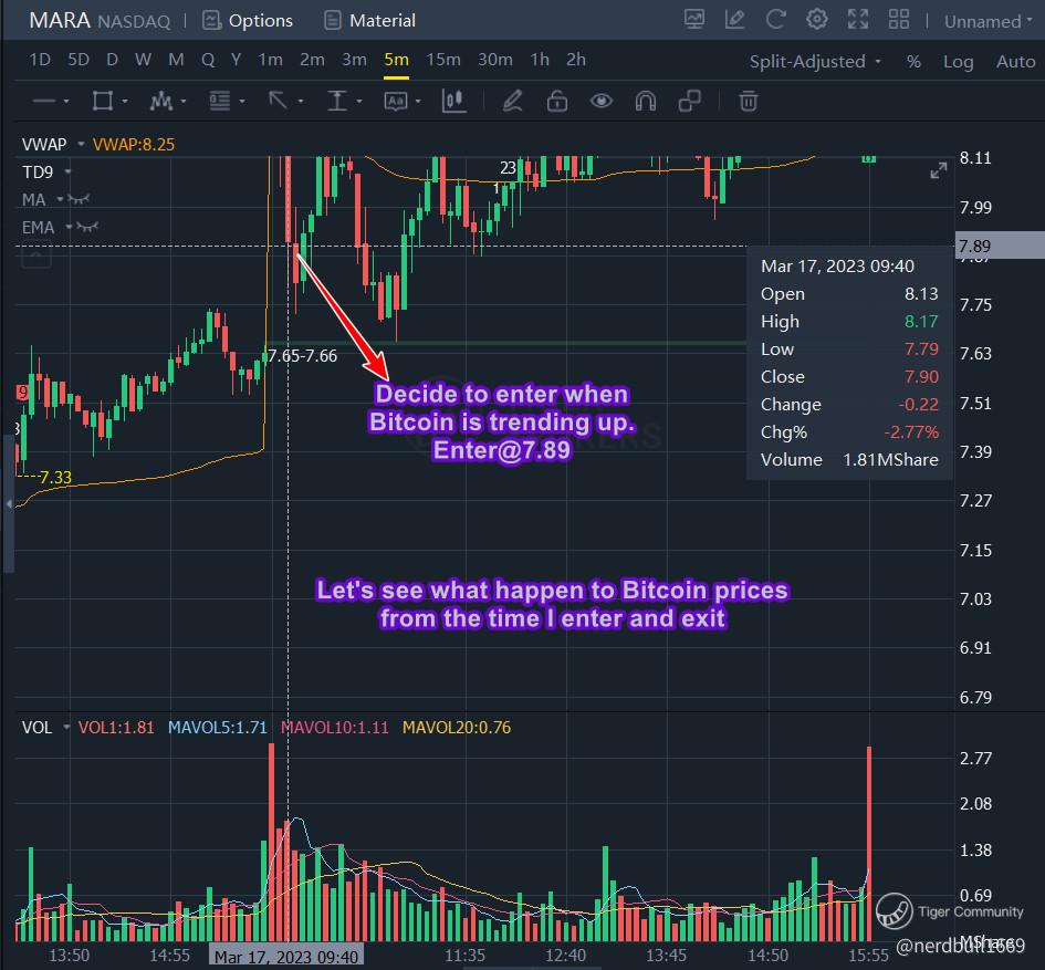 MARA actually reach its high at $8.68 around 6.49am on 18 March 2023, whereas Bitcoin reach its High at around 6am.