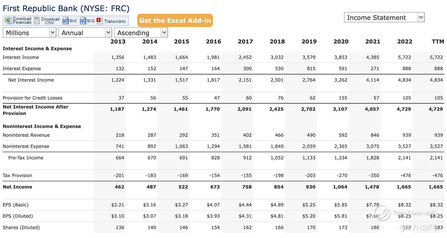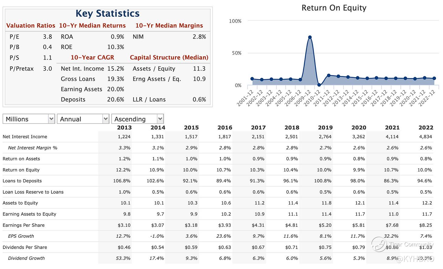 In the last 10 years, net interest income grew from $1,187M (2013) to $4,729M (2022). The Net Income grew from $664M (2013) to $1,665M (2022). Shares have been diluted from 138M (2013) to 183M (2022).