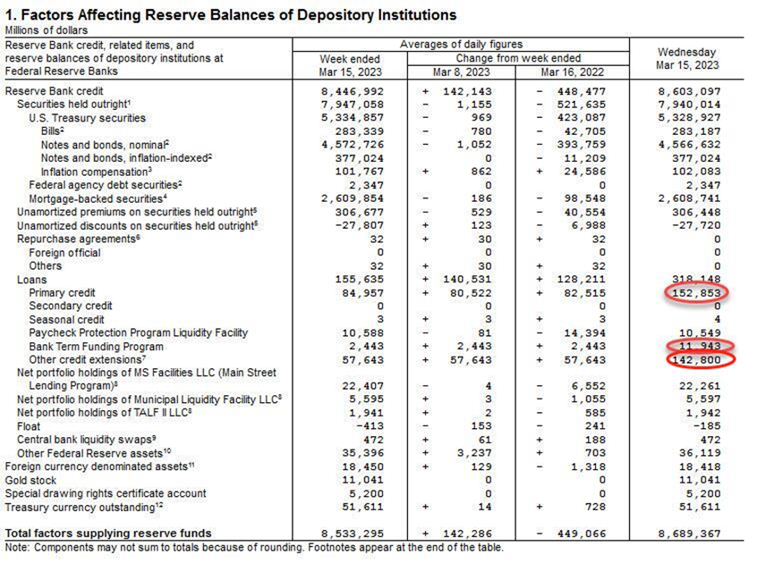 Borrowing under the discount window of the Fed's liquidity instruments surged to $152.85 billion in the week ending March 15;