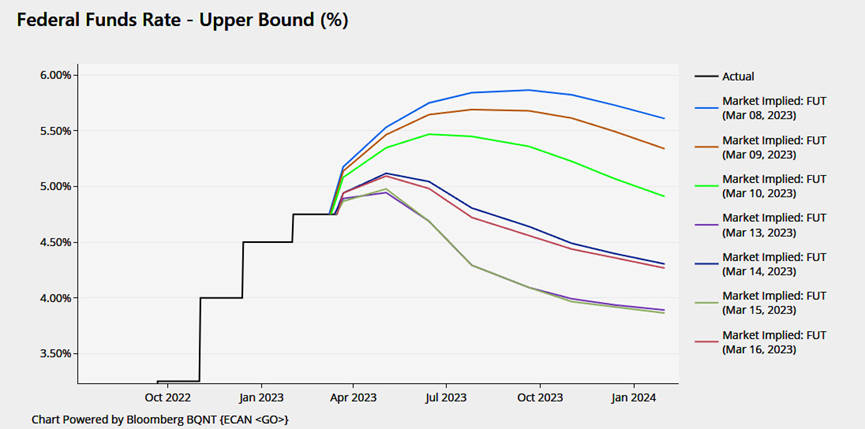 After that, the interest rate was expected to drop sharply to the end rate of 4.75% on March 15th (green line above). March 16th, with the crisis between Credit Suisse and American small and medium-sized banks coming to an end, the market returned to stability, with an expected end rate of 5.25% (red above) and an 80% probability of 25 basis points in rate hike on March 22nd.