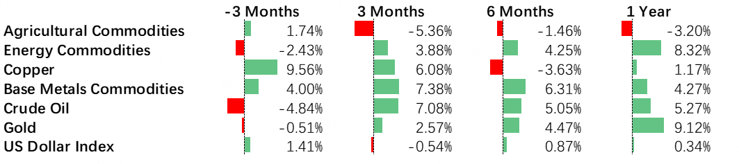 Gold futures $Gold - main 2306(GCmain)$ and energy commodities represented by crude oil $WTI Crude Oil - main 2305(CLmain)$ performing the best, industrial metals represented by copper performing decently, and agricultural products performing poorly. Apart from that, the US dollar performed only moderately.