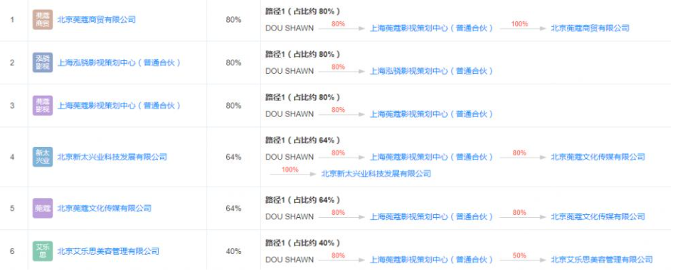 現為存續狀態的上海蔸蔻影視策劃中心(普通合夥)成立於2015年4月,竇驍持股80%,為大股東及最終受益人。通過直接或間接持股,竇驍擁有北京蔸蔻商貿有限公司、北京艾樂思美容管理有限公司等6家公司的實際控制權,版圖涉及影視、傳媒、商貿、科技等。