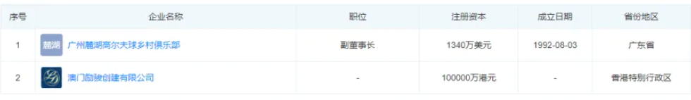 公開資料顯示,何超蓮共關聯2家企業,分別為廣州麓湖高爾夫球鄉村俱樂部、澳門勵駿(0.35, 0.01, 1.45%)創建有限公司。其中廣州麓湖高爾夫球鄉村俱樂部成立於1992年8月,由何超蓮母親陳婉珍任法定代表人及董事長,何超蓮任副董事長,其姐姐何超雲與弟弟何猷啓任董事。