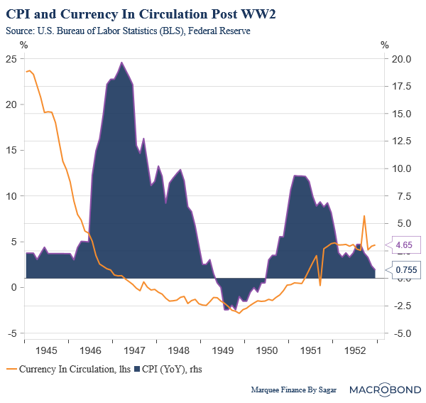 Inflation in 1946–47 peaked at 20%, and plunged as the Money Supply came down.