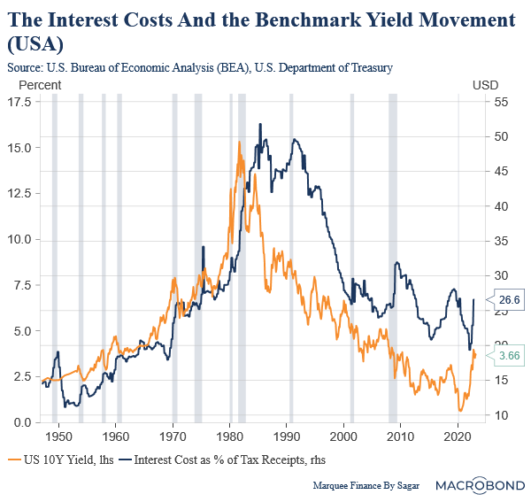 - Rising Interest Costs as % of Tax Receipts: If the rates remain in the 3–5% zone for the next 2–3 years, we might see the figure touch as high as 40–50% because it’s different than the 80s now (Debt/GDP is exceptionally high, so the magnitude of the rise will be swift).