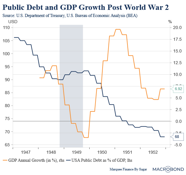 As a result of high GDP Growth, the Government Debt/GDP, which zoomed past 130% during the war, came down to 75% by 1950.