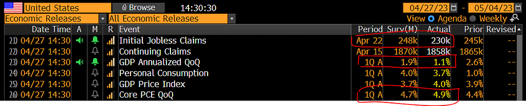 While inflation, as measured by the Core PCE QoQ, surprised on the upside, the GDP came in lower than expected (we can’t ignore the impact of the SVB fallout, which impacted consumption in March), and employment numbers were beat.
