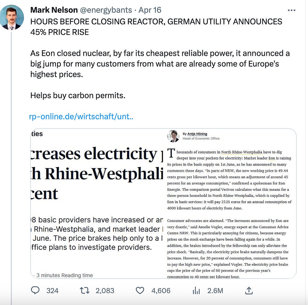 • When I said that the green transition is going “nowhere”, I meant that the “Energiewende” has done more harm than good for Germany. You will be astounded to know that after the closures of the last three nuclear power plants a fortnight ago, Germany has dramatically increased its electricity imports.
