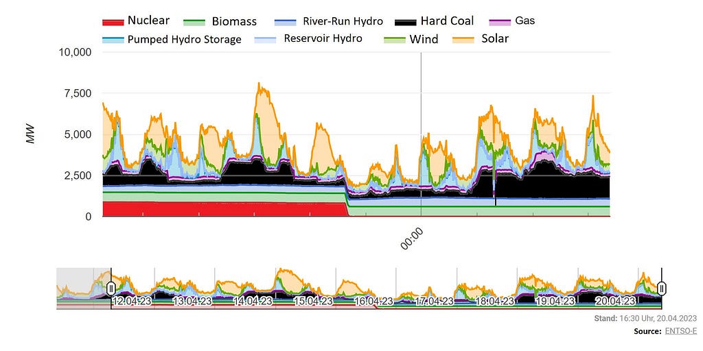 As a result, a 100% transition to renewables, especially without nuclear power, is unviable. In fact, as Germany closed its nuclear plants, the void was filled by the “dirty” coal power (see the black area post the end of red) instead of the “clean energy”.