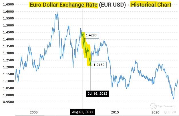 • US dollar sold off. Looking at above exchange rate between US and Euro dollars. The slip started from 01 Aug 2011. It finally bottomed on 16 Jul 2012 before staging a recovery.