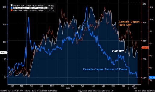 The Russia-Ukraine conflict that started all this is still in full swing. Those commodities are still unavailable to most markets in the West. Although so far to start the year the key commodity (gas for Europe) has continued to ease off in price as a warmer winter has meant lower demand whilst US LNG supply has been able to fill the gap. As a result the Have Not, Europe, has been on a track of improvement. Whilst the Have, the US, has been slowing down due to tighter Fed policy. As a result EURUSD has traded from 0.9536 in September to 1.0927 this month, levels we were at in March 2022. For the trend higher in EURSUD to continue we would need to see a continued convergence in rate differentials between Europe and the US. Therefore the Fed and ECB meetings next week are going to be critical. The ECB is almost fully priced to hike 50bps. Meanwhile the Fed is priced to hike just 25bps. Given what is priced I see a risk of ECB disappointing whilst Fed overdelivers. US financial conditions have eased significantly this year. The Chicago Fed’s index of financial conditions show that they are currently much looser than they should be given prevailing macroeconomic conditions. Given that the battle against inflation is not over yet I expect Powell to want to tighten financial conditions. Tighter US financial conditions and a slowing global economy would be a very negative backdrop for risk assets so I still expect safe havens USD, CHF and XAU to outperform whilst EUR, GBP and growth currencies underperform. Given that the BOC are at the end of their hiking cycle CAD is likely to take the brunt of any risk off selling.