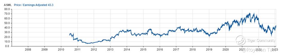 With a current trailing Price to Earnings ratio of 43x, ASML is trading at approx. its 10-year average level.