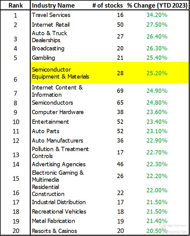 The table below shows the Top 20 strongest-performing industries in 2023 on a YTD basis (exclude industries with < 5 names)