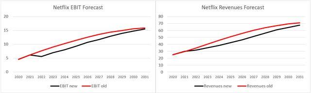 When we looked at our assumptions from two years ago, we noticed that they do not significantly differ from our current assumptions. Netflix is still expected to reach about $70bn in Revenues by 2031 and generate about $17bn in EBIT.