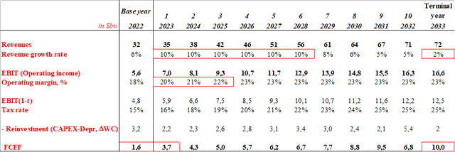 Our current forecast incorporates actual numbers for 2022 and assumes a slightly higher average growth rate (10%) to come up with the same results at year 10. Both models project free cash flow ("FCF") of about $10bn in year 10, which is basically one of the most important parameters in determining company's value (about 70%-80%, depending on the discount rate).