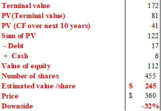 WACC:If we change the discount rate (WACC) to 6.5%, which is only 3% above the 10-year treasury bond rate, fair share price would increase to $333, which is close to the current share price. WACC of 8.5% would warrant $213 in estimated fair share value.