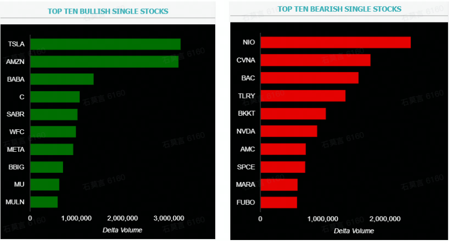 This report shows stocks with the highest volume of bullish and bearish activity by option delta volume, which converts option volume to an equivalent stock volume (bought or sold).