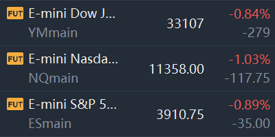 At 7:55 a.m. ET, Dow e-minis were down 279 points, or 0.84%, S&P 500 e-minis were down 35 points, or 0.89%, and Nasdaq 100 e-minis were down 117.75 points, or 1.03%.