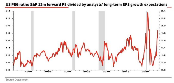 $S&P 500(.SPX)$ Aside from the economic turmoil during the March 2020 Covid Pandemic, the S&P 500 PEG Ratio has never been higher (since 1985).And most think EPS estimates are still too high. So, the only thing that could change this is much better earnings in 2H23, which seems like a stretch, but maybe what market is telling us…