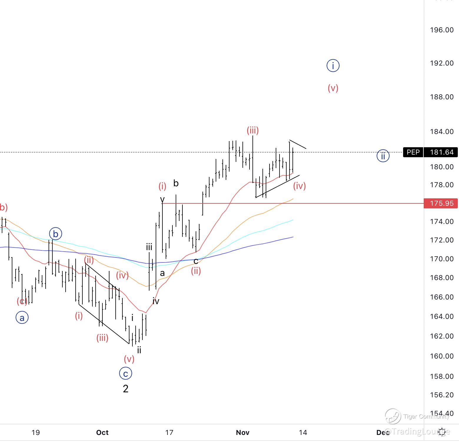 PEP Trading Strategy:Placing longs with a stop below red line, looking for a short andpotentially quick upmove in wave (v).