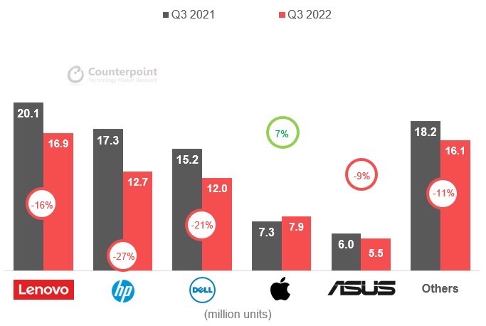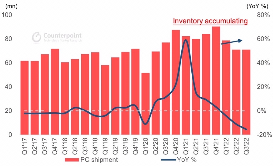 I think global semiconductor and PC sales have already been hit by high inflation leading to lower disposable revenue, and I think that will continue to impact AMD in the next four quarters as well, and in terms of PCs, all but the Apple brand are currently down year-over-year (Figure 1). Then, with the current PC inventory still at a relatively high point, I suggest that for those who want to buy computers, they may wait until the middle of next year, when a round of price cuts may be launched to clear or reduce old inventory (Figure 2). According to my observation, it has already started, but I think it may further deteriorate.