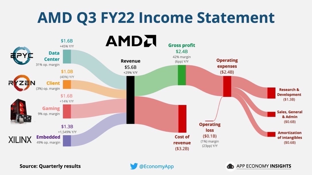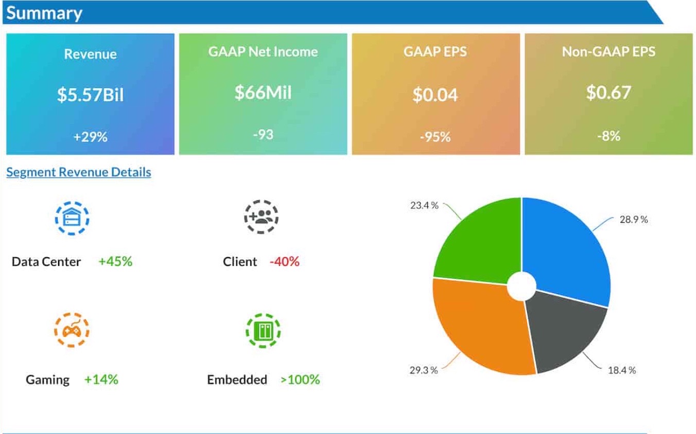 Revenue was $5,565 million, up 29 percent from $4,313 million in the prior year quarter, and GAAP net income was $66 million, down 93 percent from $923 million in the prior year quarter. On a non-GAAP basis, AMD reported third quarter adjusted net income of $1.095 billion, up 23 percent from $893 million in the prior year quarter. According to the official statement, the difference in profit was mainly due to the amortization of assets and increased investment in R&D as a result of the acquisition of Ceres. So I think AMD's results are actually acceptable, I just don't think they are growing as much as the market would like.