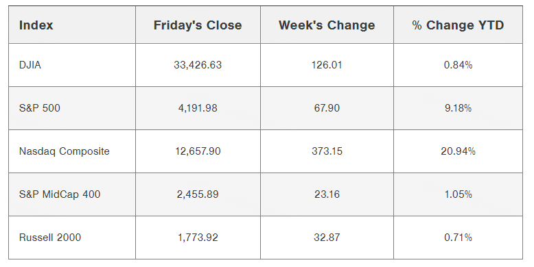 Stocks recorded solid gains for the week, with the S&P 500 Index breaching the 4,200 level in intraday trading for the first time since late August.
