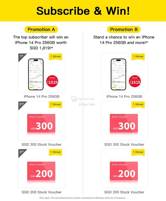 Promotion A: The top subscriber will win an iPhone 14 Pro 256GB worth SGD 1,819!