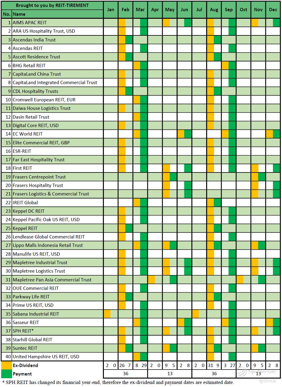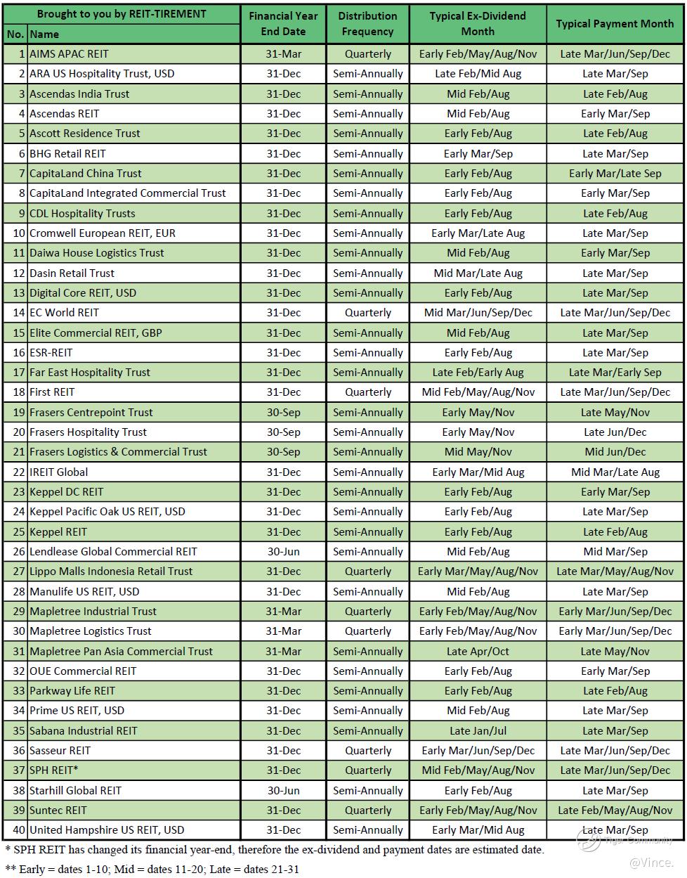 Anyway, it has been some time since the last update on the typical ex-dividend date for each REIT, today let's spend some time going through it again. At this moment, there are 33 REITs, 5 stapled Hospitality Trusts (combination of REIT & BizTrust) and 2 BizTrust which operate similarly to REITs.