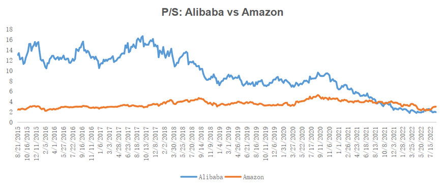 In terms of P/S valuation, Alibaba's current valuation multiple is only 1.9x, lower than Amazon's 2.9x.