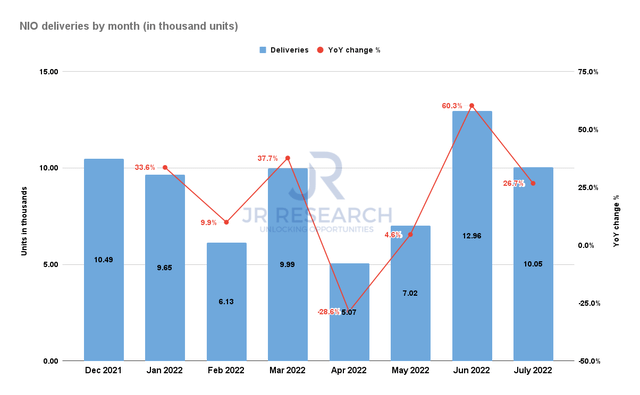 NIO updated that it delivered 10.05K of vehicles in July, up 26.7% YoY. However, the momentum has moderated from June's deliveries of 12.96K (up 60.3%) of vehicles, following the reopening from April-May's draconian COVID lockdowns.