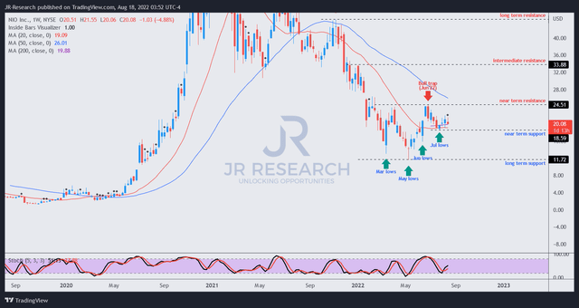 Notwithstanding, the near-term resistance that marked NIO's June highs could continue to offer robust selling pressure in the near term. Therefore, investors should avoid adding close to that level.